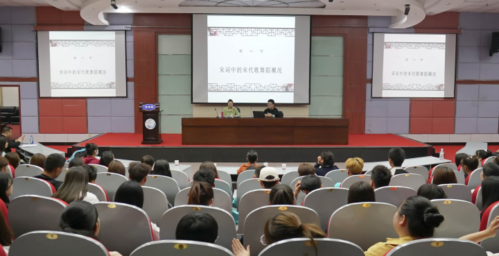 金秋教授从宋词中的宋代歌舞概况、宋词中的宫廷礼仪乐舞、宋代中的传统经典乐舞、宋词中的民间乐舞、宋词中的乐舞伎人、宋词中的宋代歌舞表演特点、宋代歌舞在中国舞蹈史上的地位等七个方面进行了讲解。金秋教授的讲解生动幽默、引经据典,使师生们对宋词中的乐舞和宋代舞蹈史有了全新的认知和感悟,受益匪浅。
